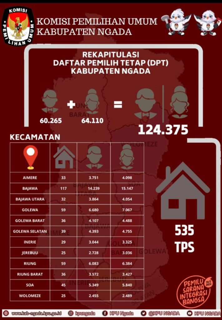 Tahapan persiapan jelang Pemilu Nasional 2024 secara bertahap dilaksanakan oleh KPU termasuk KPUD Ngada. Komisi Pemilihan Umum Daerah (KPUD) Ngada resmi menetapkan 124.375 daftar pemilih tetap (DPT) di lantai dua aula KPUD Ngada, Selasa (20/6/2023). Dalam surat keputusan nomor: 203/PL.01.2-BA/5309/2023, KPUD Ngada mencatat, pemilih perempuan mencapai 64.110 orang sementara pemilih laki-laki berjumlah 60.265 orang. Berikut Rincian DPT Per Kecamatan di Kabupaten Ngada : KECAMATAN JUM TPS LAKI-LAKI PEREMPUAN AIMERE 33 3.751 4.098 BAJAWA 117 14.239 15.147 BAJAWA UTARA 32 3.864 4.054 GOLEWA 59 6.680 7.067 GOLEWA BARAT 36 4.107 4.488 GOLEWA SELATAN 39 4.393 4.755 INERIE 29 3.044 3.325 JEREBUU 25 2.728 3.036 RIUNG 59 6.083 6.384 RIUNG BARAT 36 3.572 3.427 SOA 45 5.349 5.840 WOLOMEZE 25 2.455 2.489 Cek nama anda melalui https://cekdptonline.kpu.go.id/