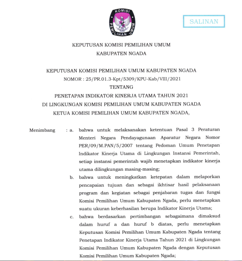 KEPUTUSAN KPU NGADA TENTANG PENETAPAN INDIKATOR KINERJA Sabtu, 03 Juli 2021 00:00 374 SK PENETAPAN INDIKATOR KINERJA UTAMA 2021 Baca Selengkapnya