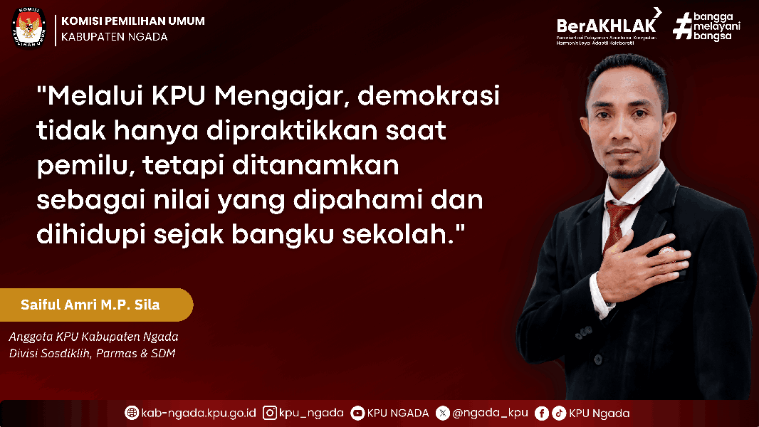 Dalam konteks ini, program KPU Mengajar menjadi momentum penting dalam memberikan pendidikan demokrasi sejak dini dan merupakan langkah strategis yang patut diapresiasi. Kehadiran Komisi Pemilihan Umum Kabupaten Ngada di sekolah-sekolah dan kampus bukan sekadar menyampaikan informasi teknis tentang pemilu, tetapi juga menjadi sarana pendidikan demokrasi. Melalui KPU Mengajar, pelajar diperkenalkan pada hak dan kewajiban sebagai warga negara, pentingnya suara dalam menentukan arah kebijakan publik, serta nilai kejujuran, keadilan, dan tanggung jawab dalam berdemokrasi. Ini merupakan bentuk investasi jangka panjang untuk menciptakan pemilih yang cerdas dan kritis.