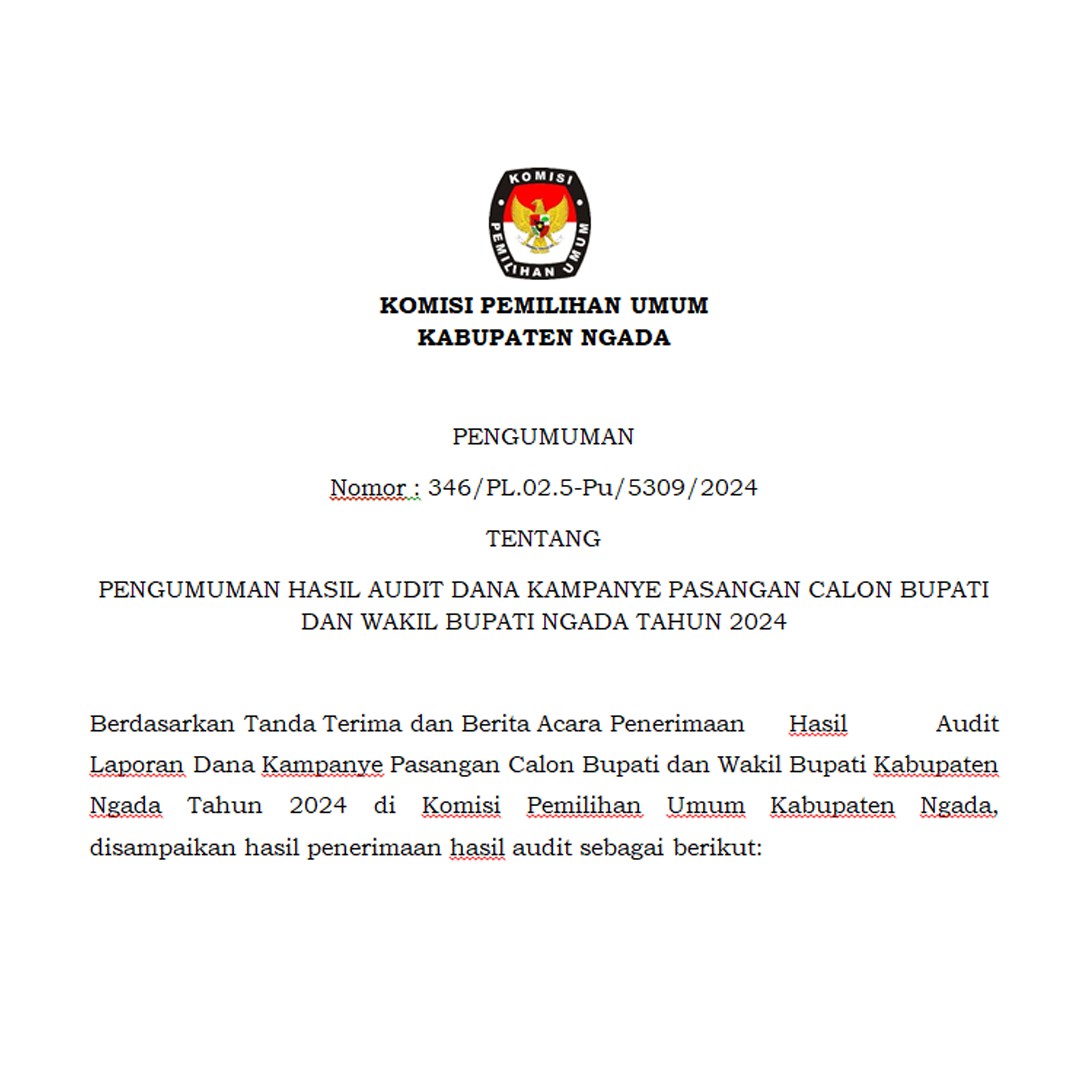 Berdasarkan Tanda Terima dan Berita Acara Penerimaan Hasil Audit Laporan Dana Kampanye Pasangan Calon Bupati dan Wakil Bupati Kabupaten Ngada Tahun 2024 di Komisi Pemilihan Umum Kabupaten Ngada, disampaikan hasil penerimaan hasil audit sebagai berikut: (dapati dunduh pada link di bawah)