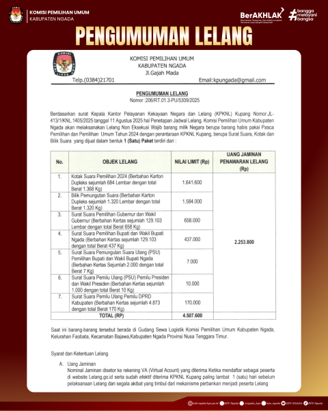 Berdasarkan Surat Kepala KPKNL Kupang Nomor JL-413/1/KNL.1405/2025 tanggal 11 Agustus 2025 tentang Penetapan Jadwal Lelang, KPU Kabupaten Ngada akan melaksanakan Lelang Non Eksekusi Wajib barang milik negara berupa surat suara, kotak suara, dan bilik suara bekas Pemilu 2024 melalui perantaraan KPKNL Kupang.
